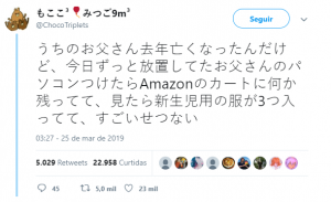 “Ninguém usava o computador do meu pai desde que ele faleceu. Hoje, notei que havia algo no carrinho da amazon, então dei uma olhada e descobri que ele planejava comprar 3 conjuntos de roupa de bebê. Agora meu coração está partido.”